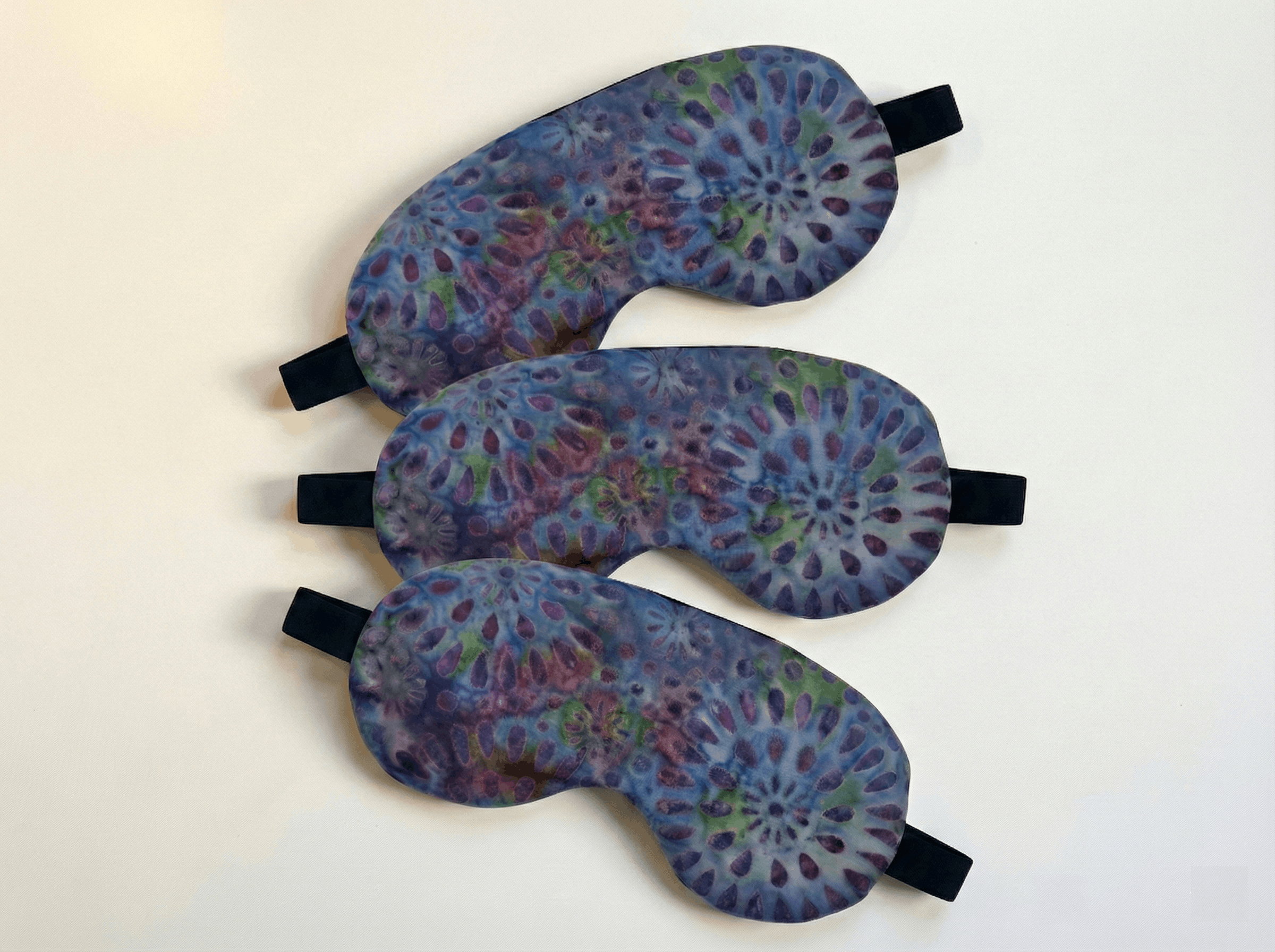 a lavender eye mask three pack. each eye mask has a purple floral tie-die pattern on it, is hand sewn, and has an elastic strap. the eye mask is filled with lavender buds has a subtle natural fragrance.Lavender Eye Mask