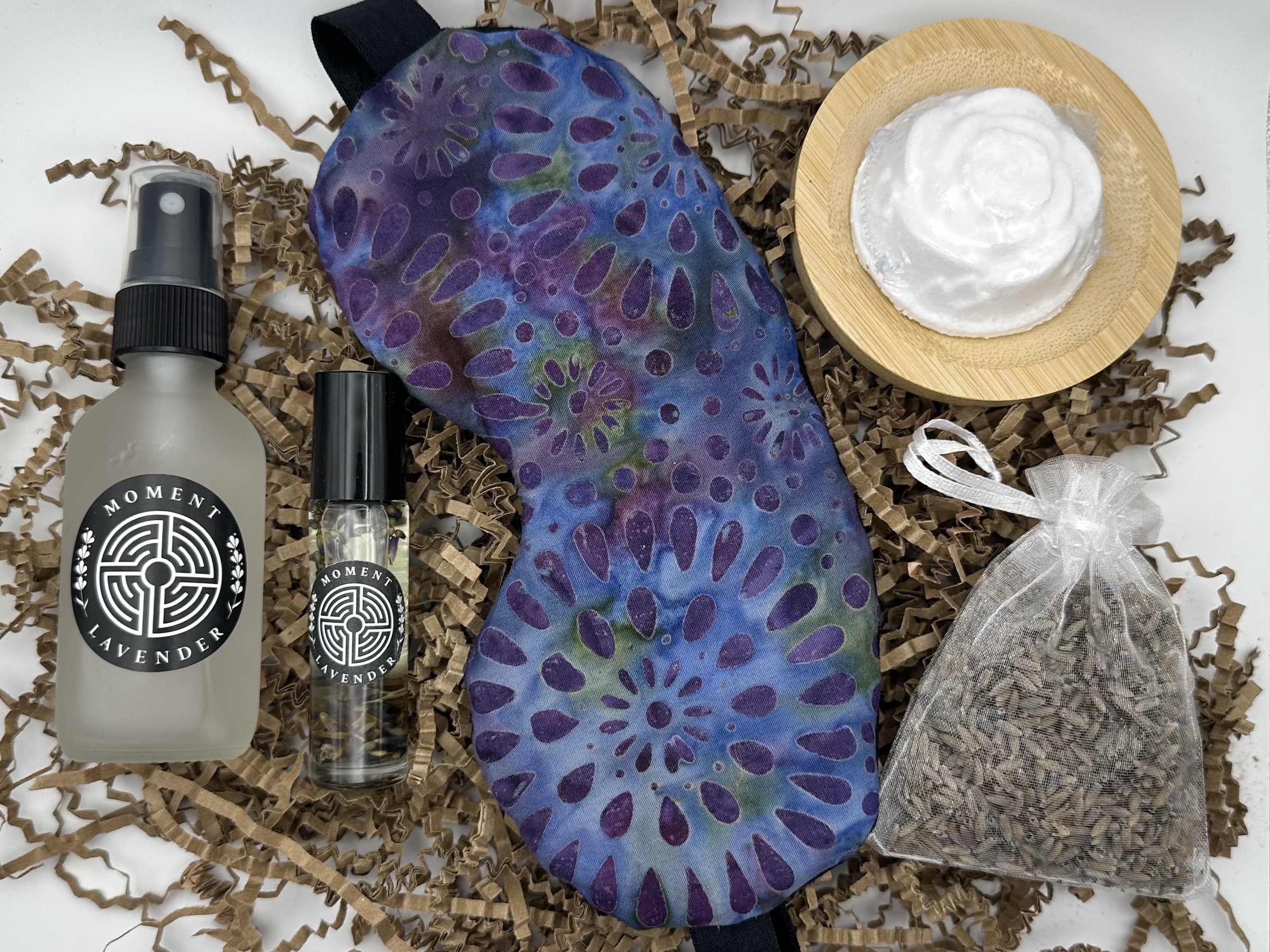 a spa gift set containing a lavender sleep mask, lavender essential oil, lavender mist, a lavender sachet, and a lavender shower steamerSpa Gift Set